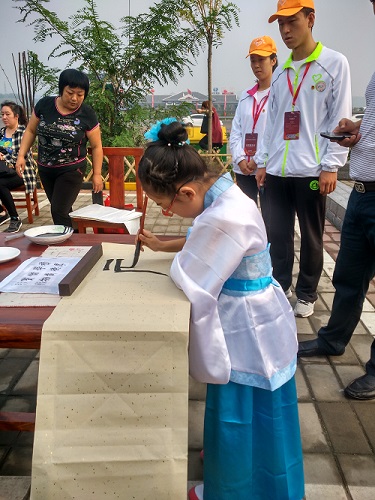 傳統(tǒng)漢服兒童書(shū)法現(xiàn)場(chǎng)展示:結(jié)合漢唐建筑風(fēng)格,易縣服務(wù)區(qū)邀請(qǐng)縣書(shū)法班小學(xué)員,著傳統(tǒng)漢服在服務(wù)區(qū)廣場(chǎng)進(jìn)行書(shū)法現(xiàn)場(chǎng)展示活動(dòng),廣受中外嘉賓青睞,尤其是外國(guó)客商,幾乎每輛車(chē)都有人索要作品留念。此舉既展示了中國(guó)傳統(tǒng)的文化,又為旅發(fā)大會(huì)增添了文化氣息。